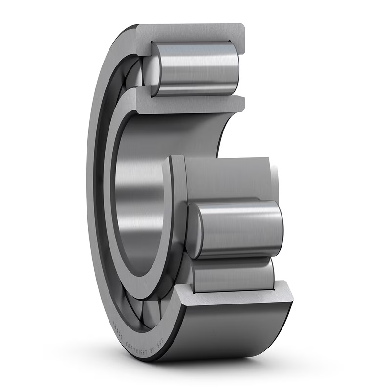 Single row full complement cylindrical roller bearings are designed to accommodate very high radial loads in combination with moderate speeds. The bearings incorporate a maximum number of rollers as they are not equipped with a cage. Having two integral flanges on the outer ring and one on the inner ring, NJG design bearings can accommodate axial displacement in one direction. A self-retaining roller complement enables the bearing components to be separated, which facilitates mounting and enables the bearing components to be interchanged.